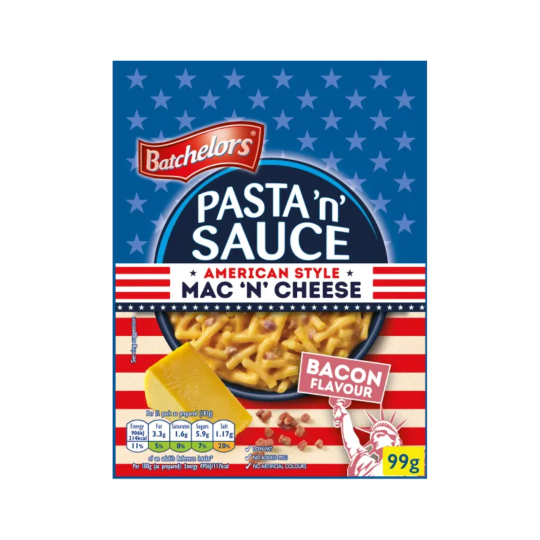 Batchelors American Style Mac & Cheese Bacon Flavour Pasta & Sauce 99g offers a savory, smoky bacon flavor combined with creamy cheese for a delicious meal.