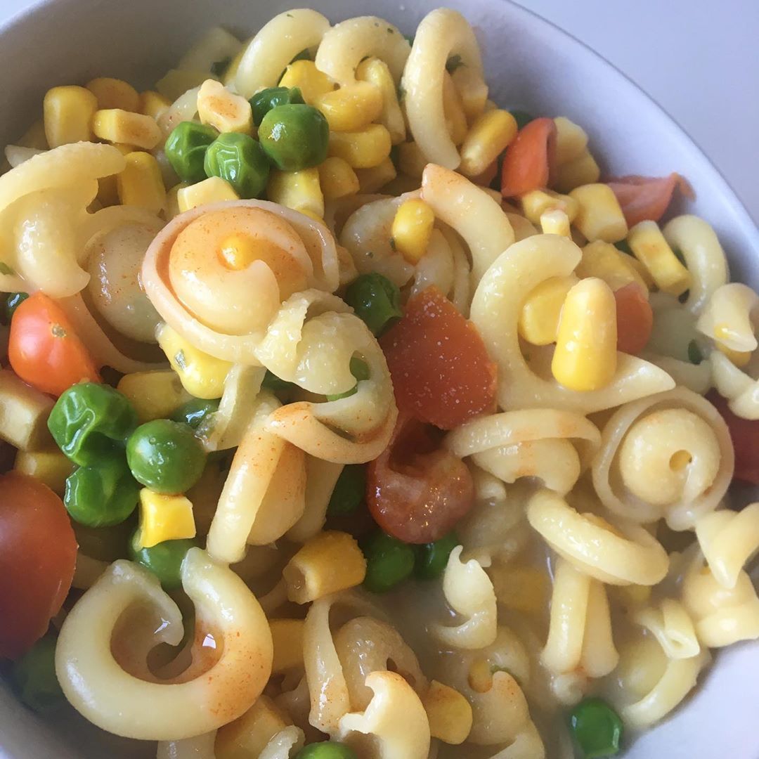- พาสต้าแห้งคลุกเคล้าในซอสรสชีสและแฮมผสมกับต้นหอม