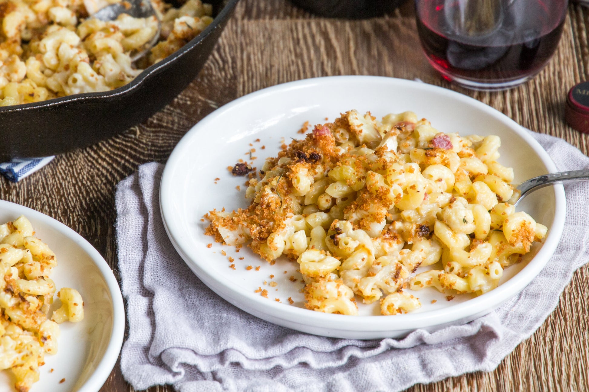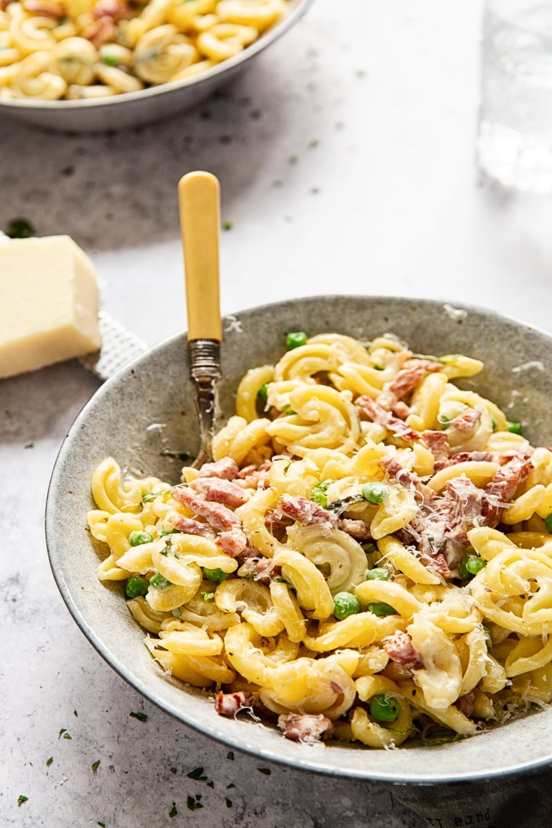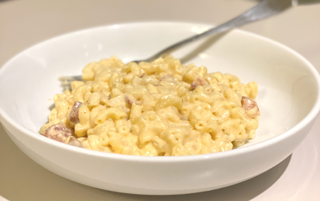 • เส้นพาสต้าแห้งในสโมกกี้ชีสและซอสรสแพนเช็ตต้าผสมกับหมู