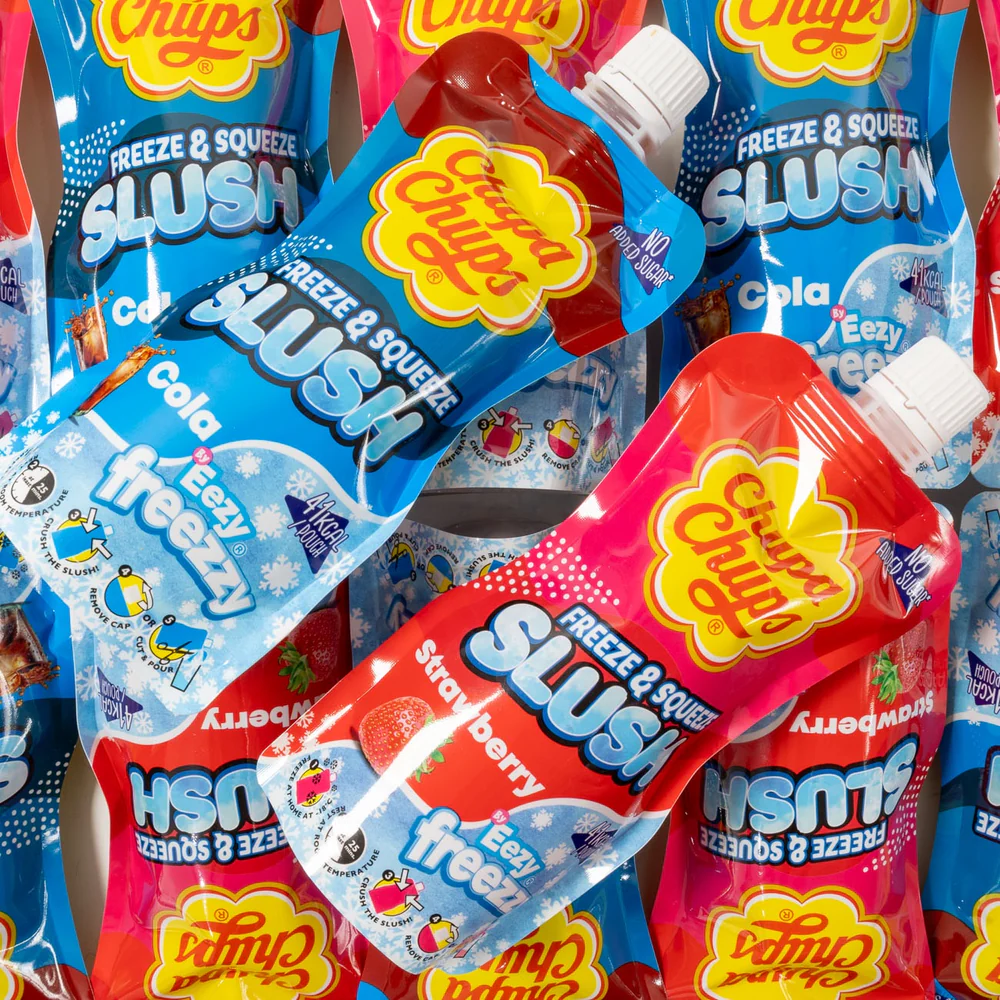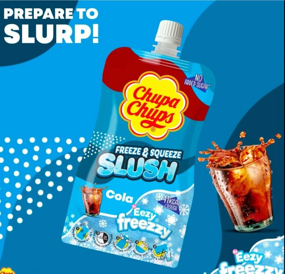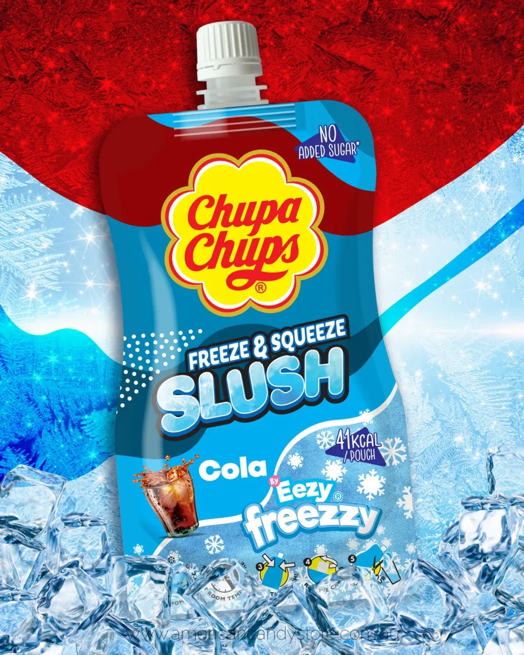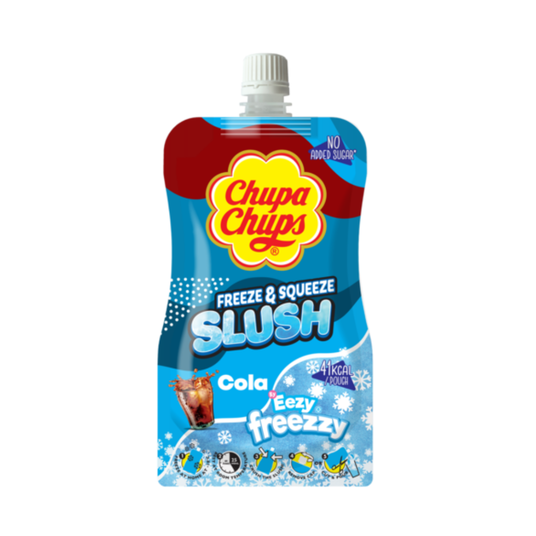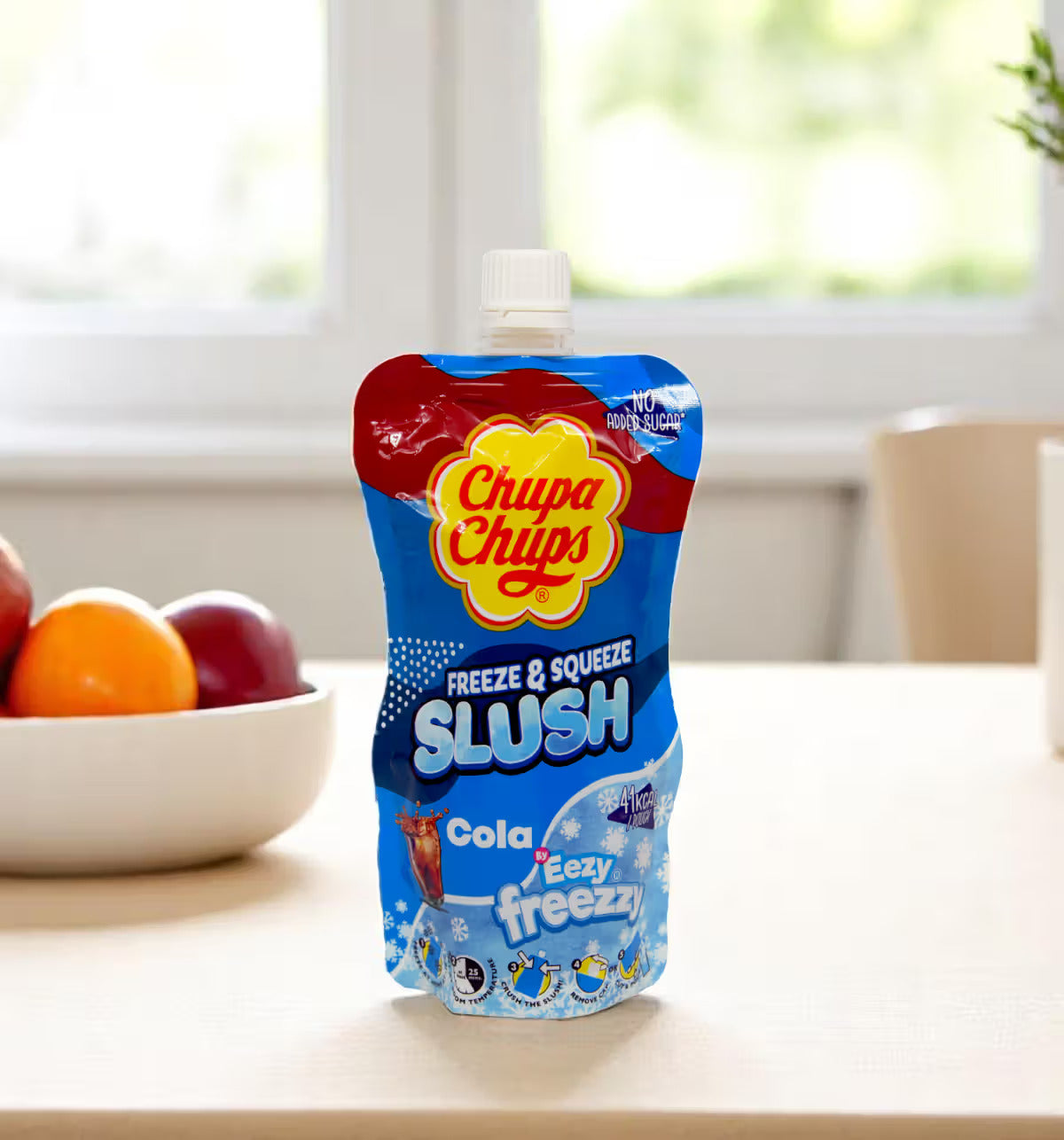 Chupa Chups Cola Slush Pouch 250g brings the iconic candy taste to a convenient, frozen form.