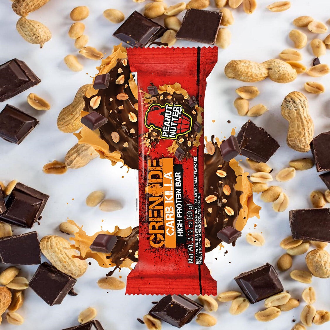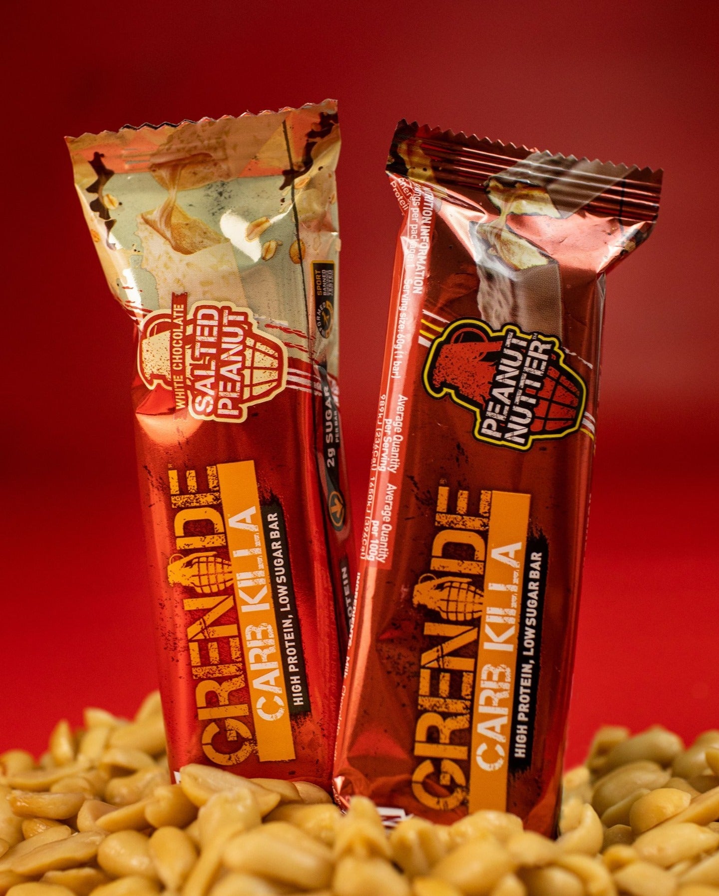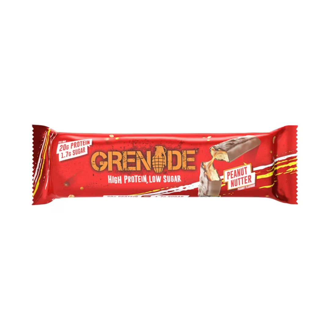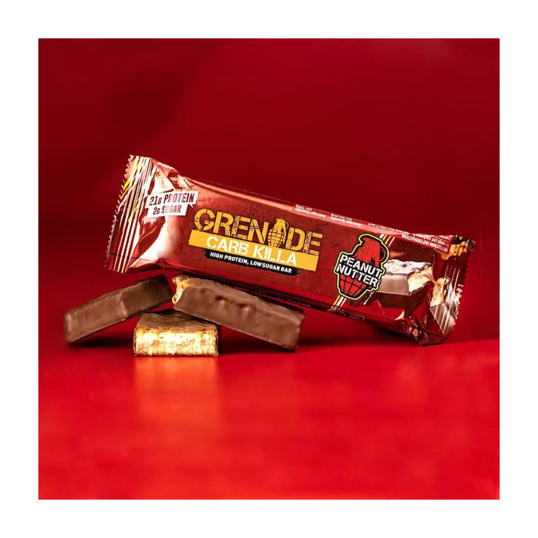 - - Triple layered and deliciously crunchy, you'll go totally nuts over this Grenade Carb Killa Peanut Nutter Cookie Bar! Each 60g protein bar contains a tiny 2g of sugar and an impressive 23g of protein – the complete (healthy) opposite of your plain old chocolate bar.