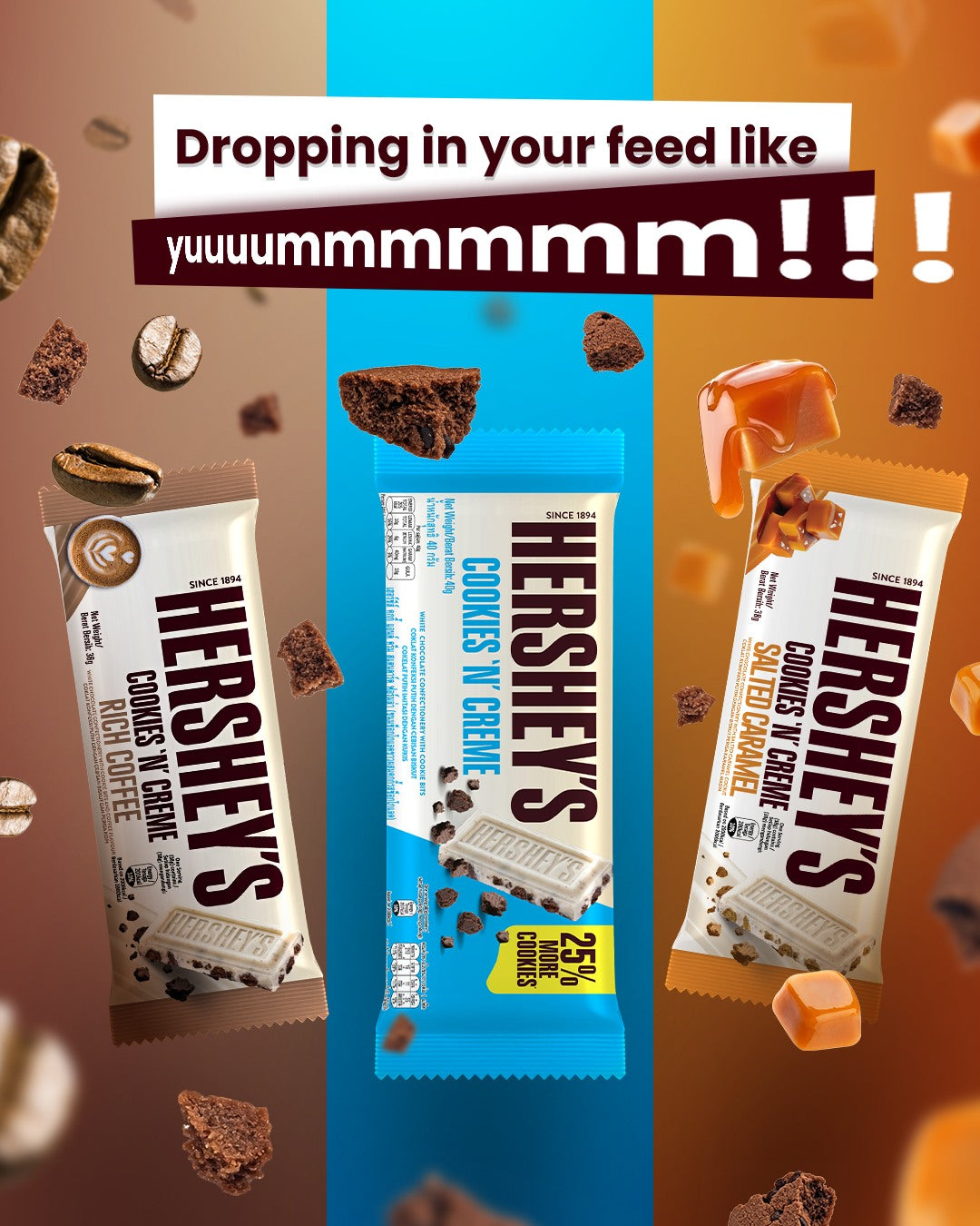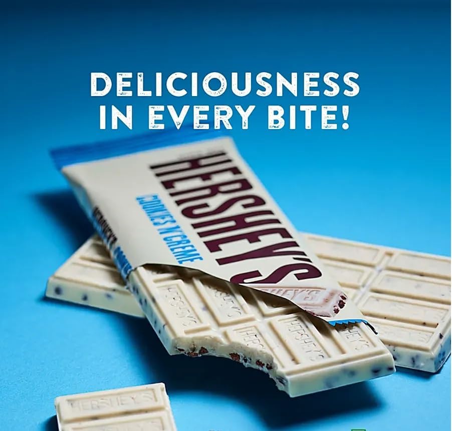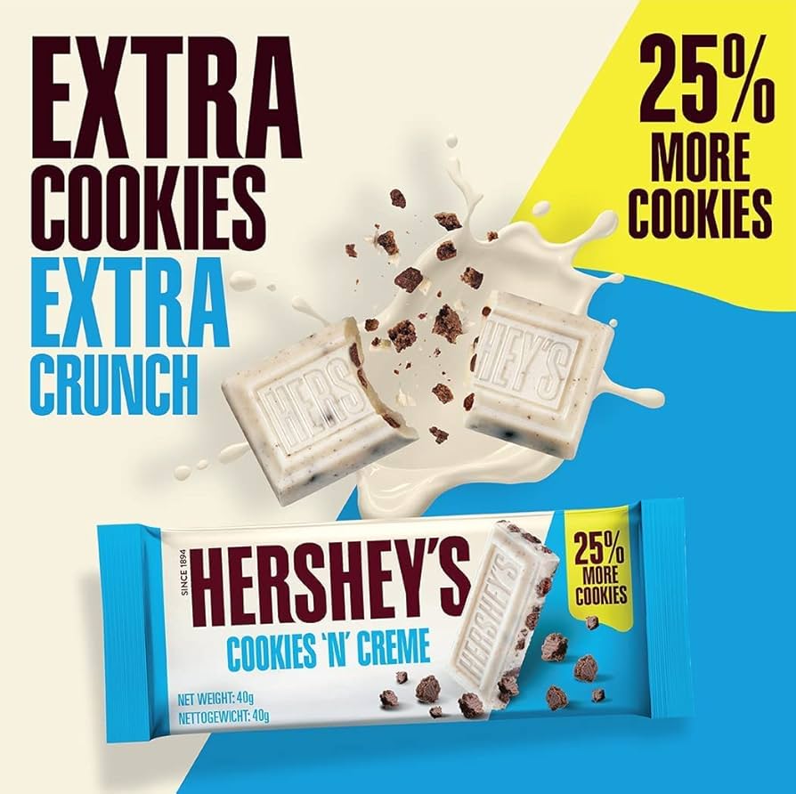 Hershey's Cookies n Cream Chocolate Bar (90g) combines smooth white chocolate with crunchy cookie pieces for a delightful contrast of textures.