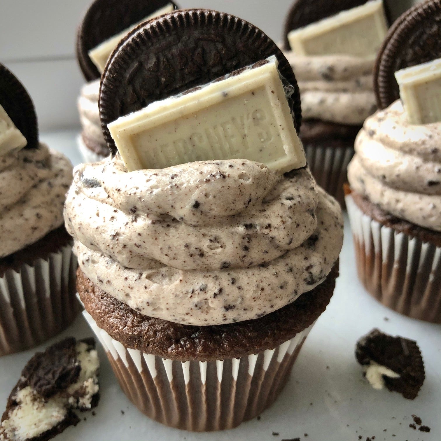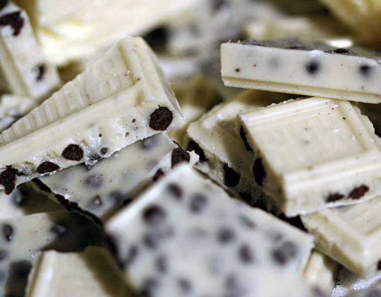 The bar features a creamy, sweet white chocolate coating that complements the rich, crunchy chocolate cookie bits inside.