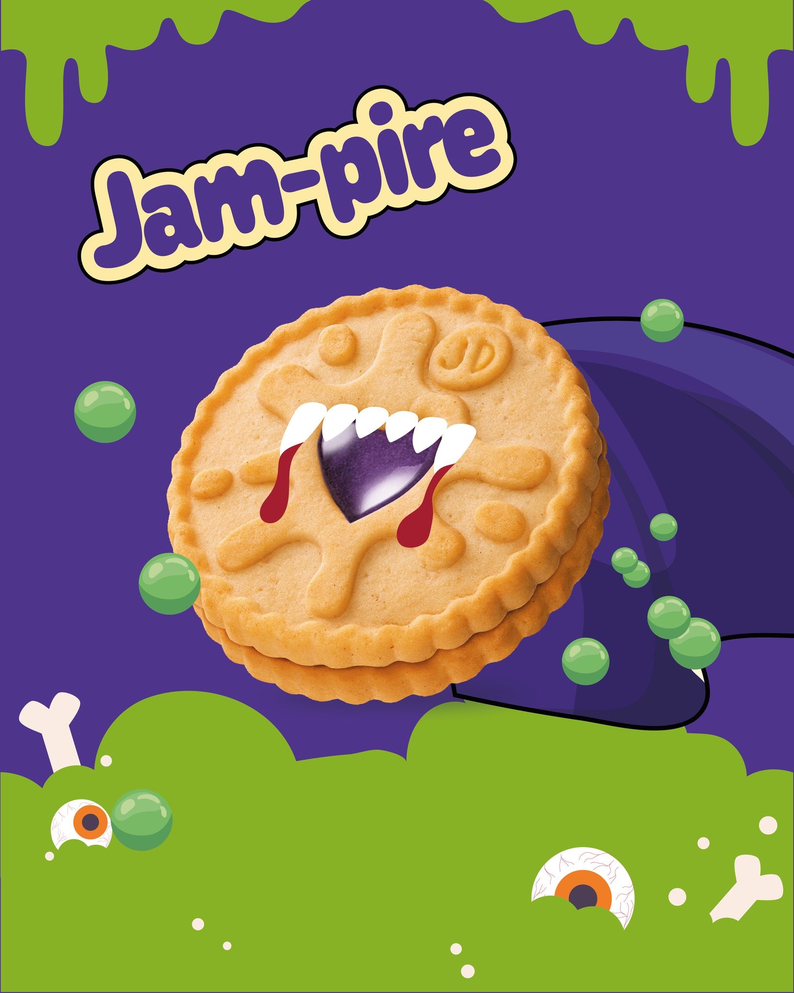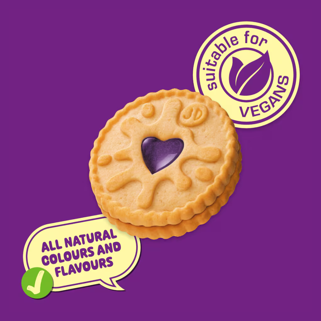 Each biscuit is made with wheat flour and vegetable oils, including sustainable palm and rapeseed, and is filled with a jam (27%) that includes glucose-fructose syrup, apples, sugar, and natural flavorings.