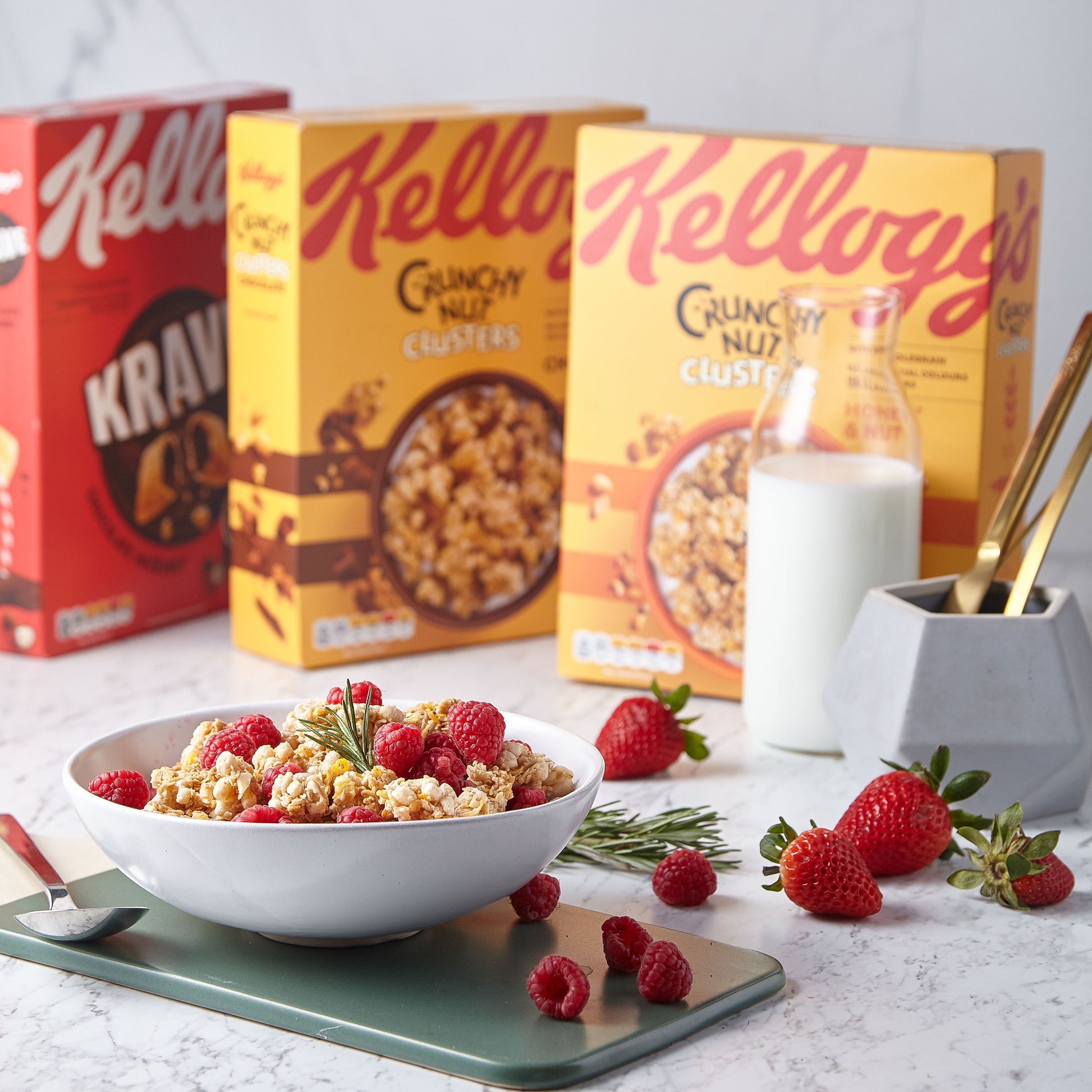 Kellogg's Crunchy Nut Chocolate Clusters Cereal offers a delicious combination of crispy corn flakes and crunchy chocolate clusters, providing a rich, indulgent breakfast.