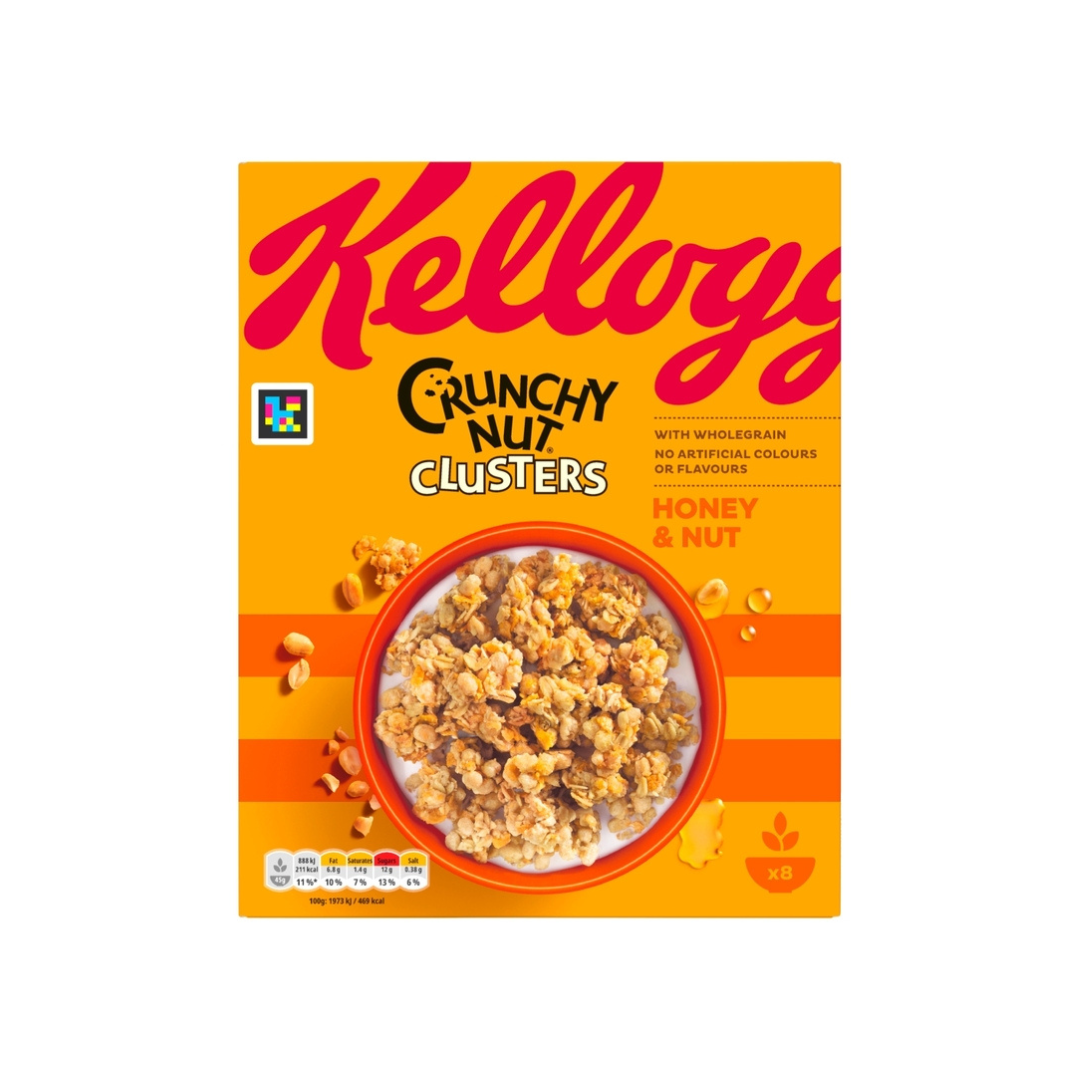 Kellogg's Crunchy Nut Clusters Honey & Nut 400g combines whole grain clusters with honey and nut flavors for a satisfying crunch.