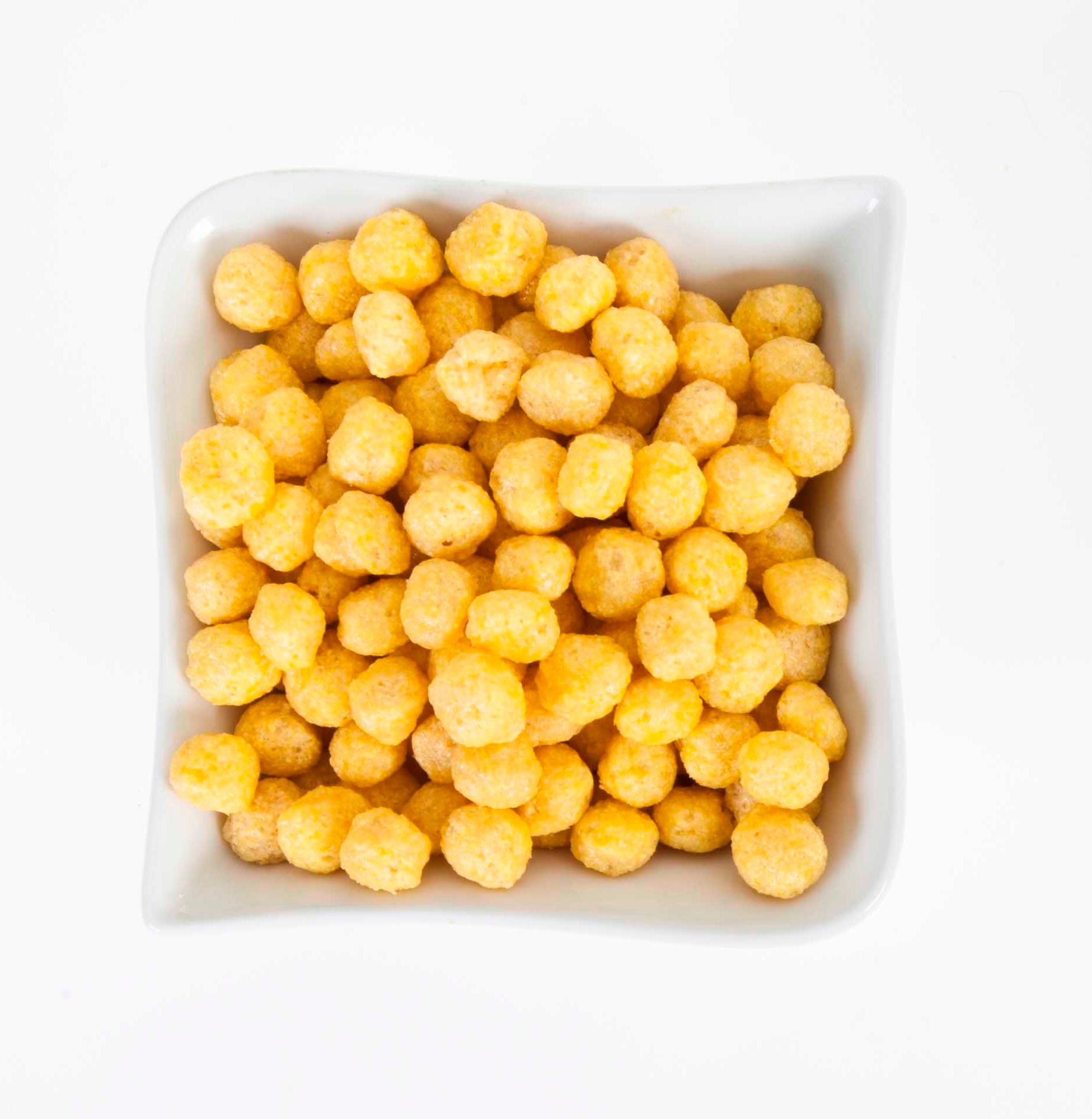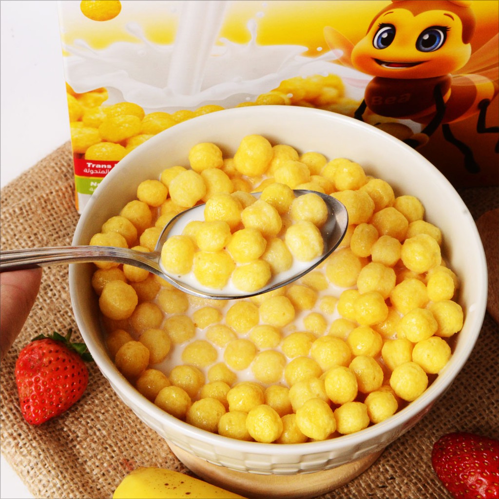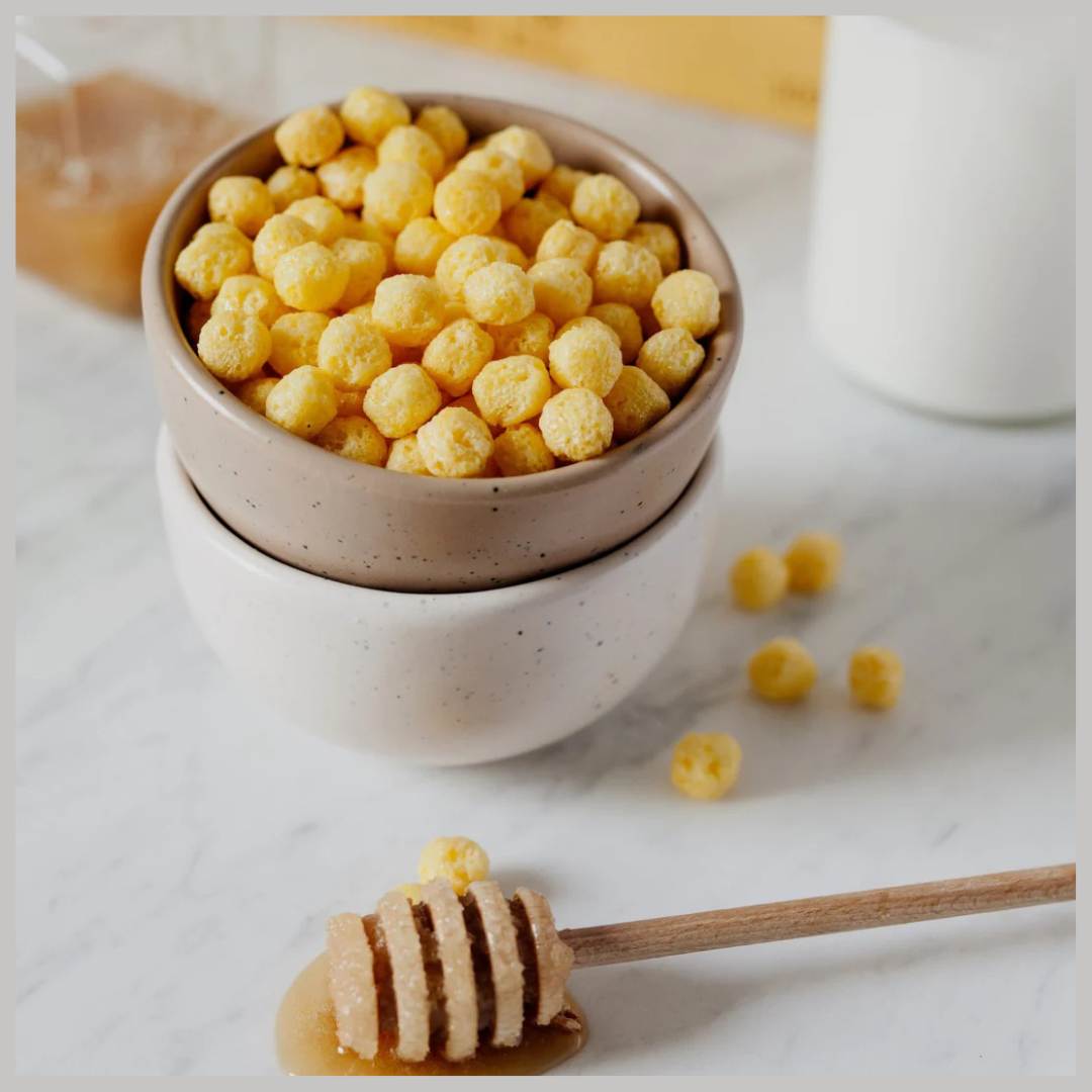 Each serving features light, puffed corn balls made from maize flour, sweetened with sugar, glucose syrup, and a touch of honey, delivering a satisfying crunch and a hint of sweetness.
