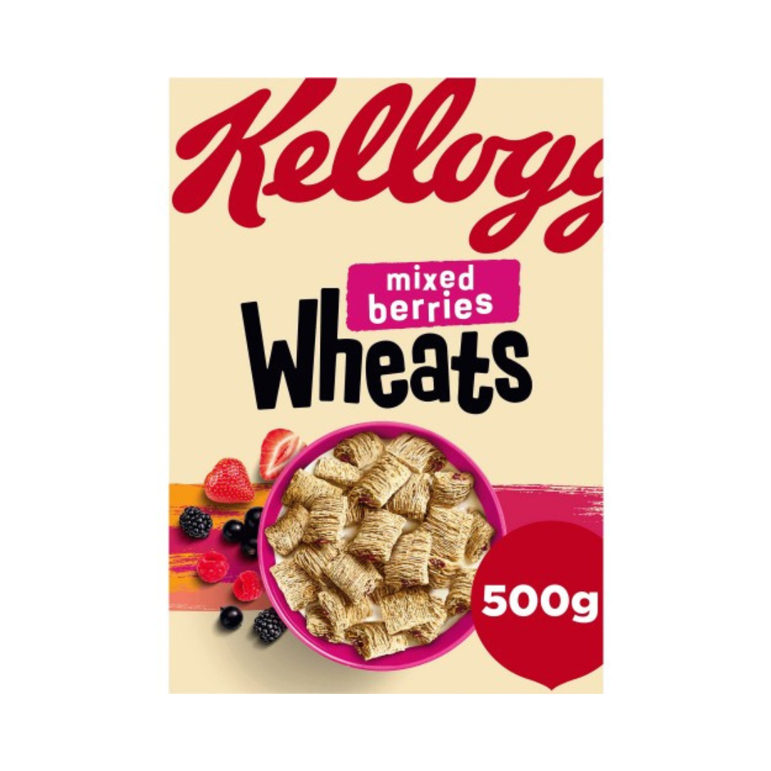 Kellogg's Mixed Berries Wheats Breakfast Cereal 500g combines whole grain wheat with a burst of mixed berry flavors for a tasty morning start.