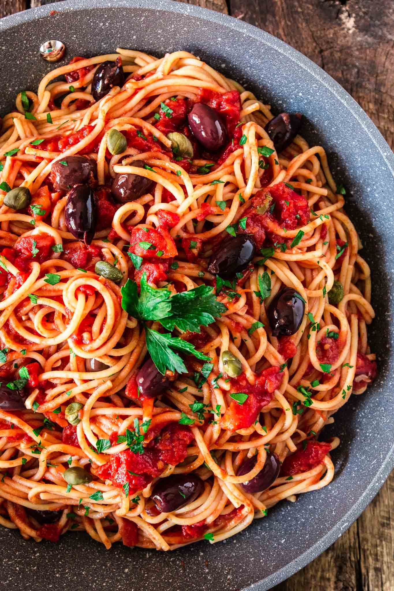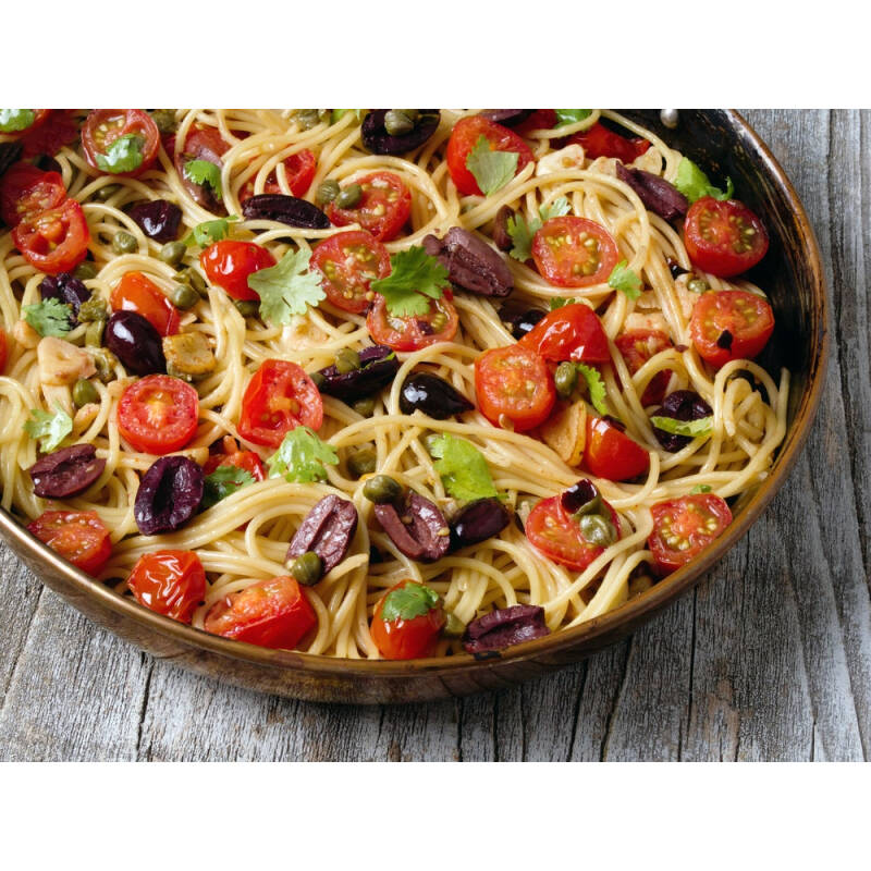 ซอสพาสต้ามะเขือเทศสุกแดดผสมกับมะกอกดำ พริกและปลากะตัก ซอสพาสต้ารสชาติเผ็ดพร้อมรับประทาน