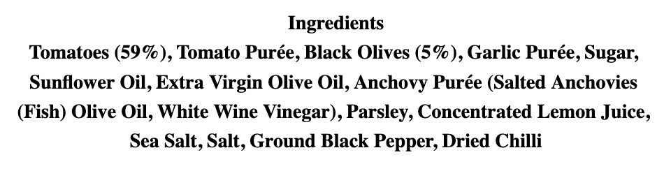 Ingredients: Tomatoes (59%), Tomato Purée, Black Olives (5%), Garlic Purée, Sugar, Sunflower Oil, Extra Virgin Olive Oil, Anchovy Purée (Salted Anchovies (Fish) Olive Oil, White Wine Vinegar), Parsley, Concentrated Lemon Juice, Sea Salt, Salt, Ground Black Pepper, Dried Chilli