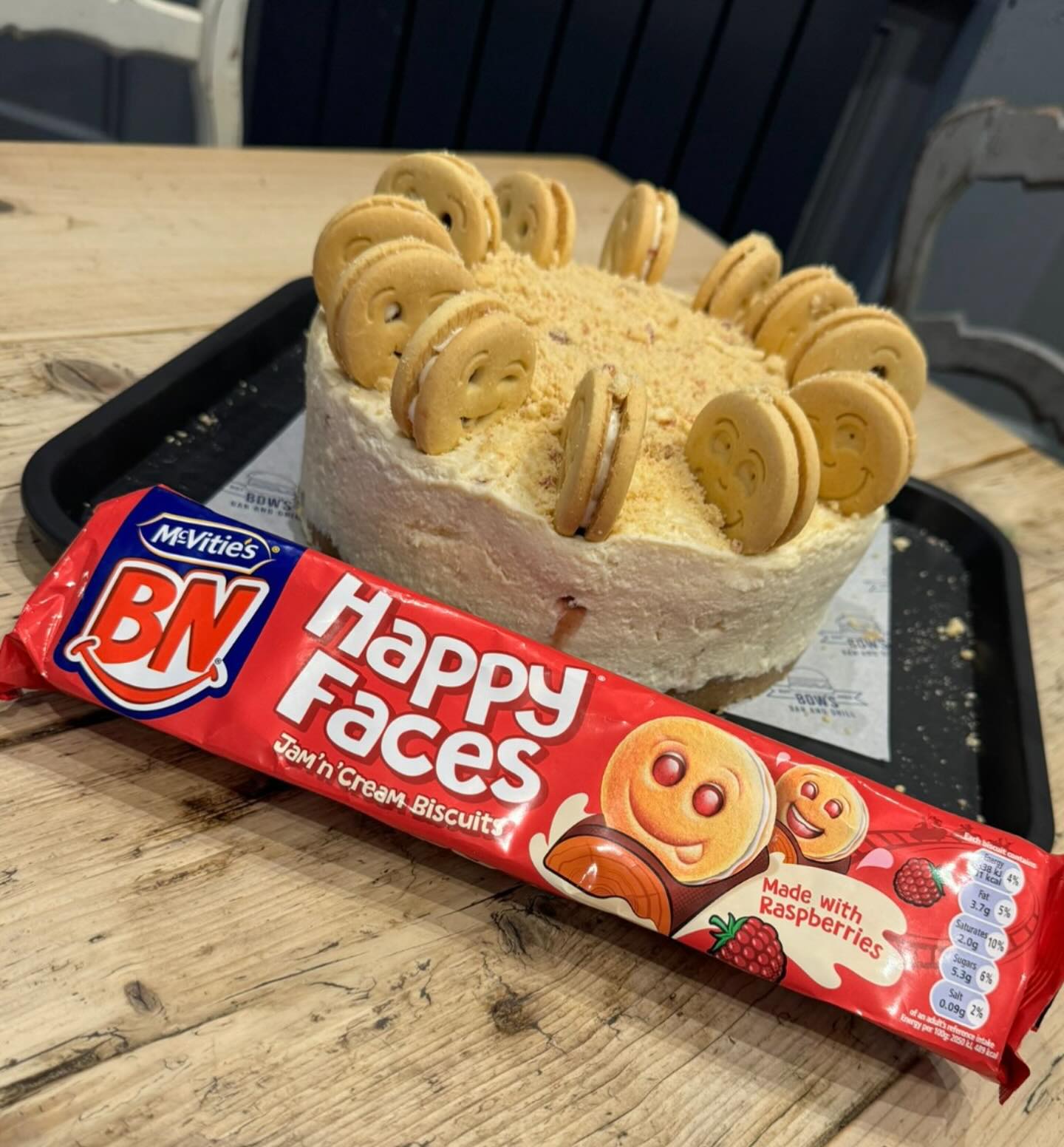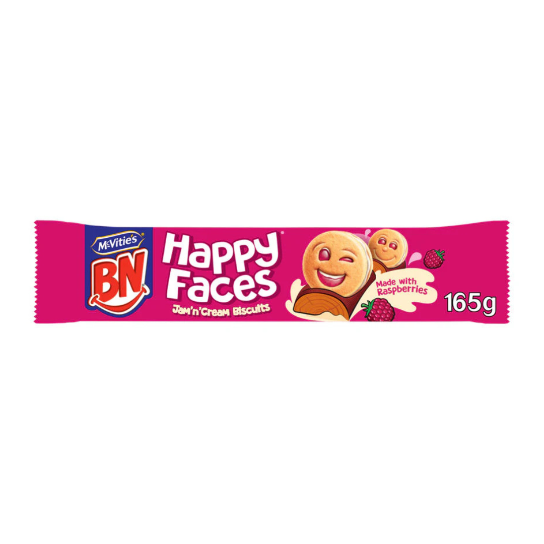 McVitie's BN Happy Faces Jam 'n' Cream Biscuits 165g feature a fun, smiley face design with a delicious jam and cream filling between two crunchy biscuits.