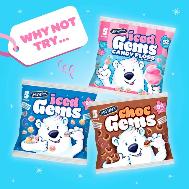 McVitie's Iced Gems Candy Floss 115g features colorful, bite-sized biscuit bases topped with a light, fluffy candy floss-flavored icing for a sweet, nostalgic treat.