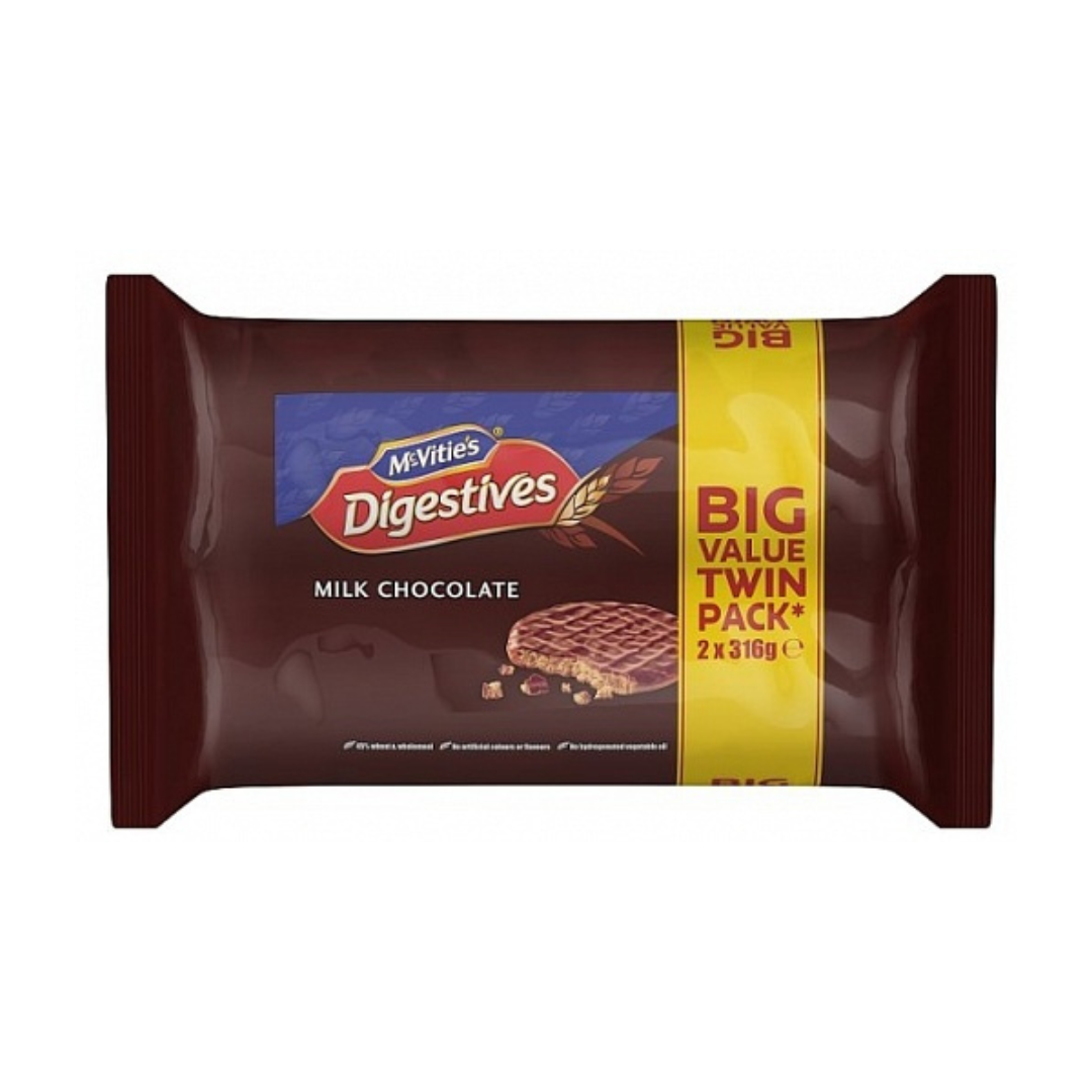 McVitie’s Milk Chocolate Digestives Twin Pack 2 x 316g features classic digestive biscuits coated in smooth milk chocolate for a rich and satisfying taste.