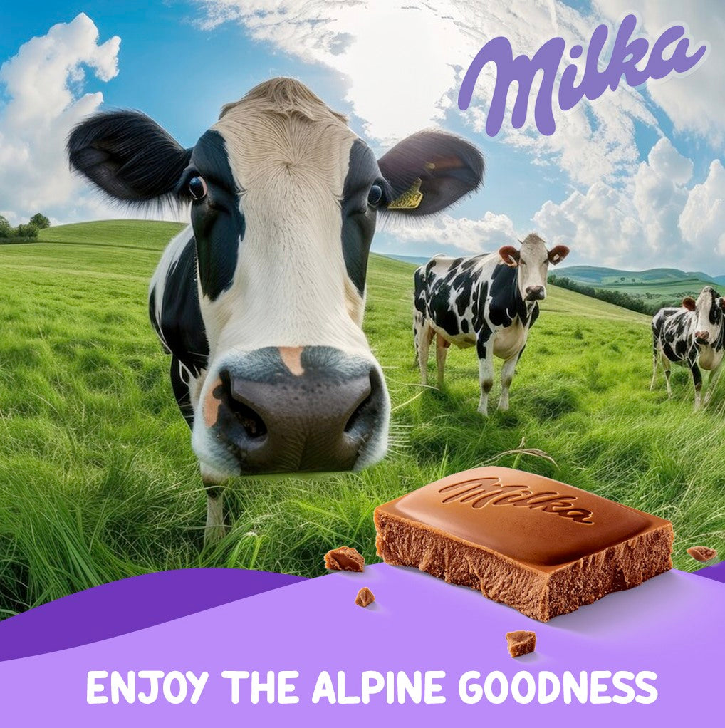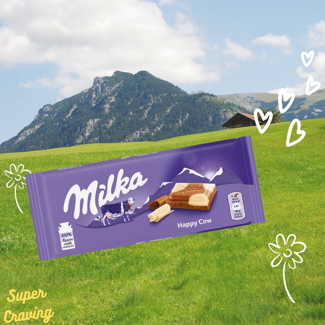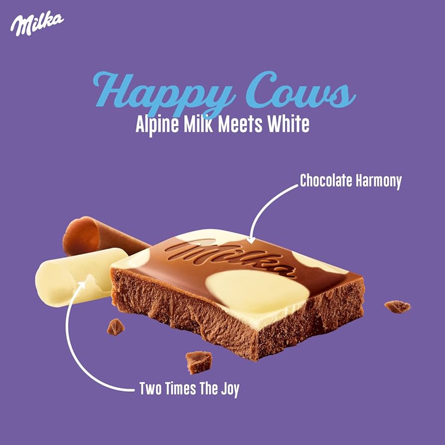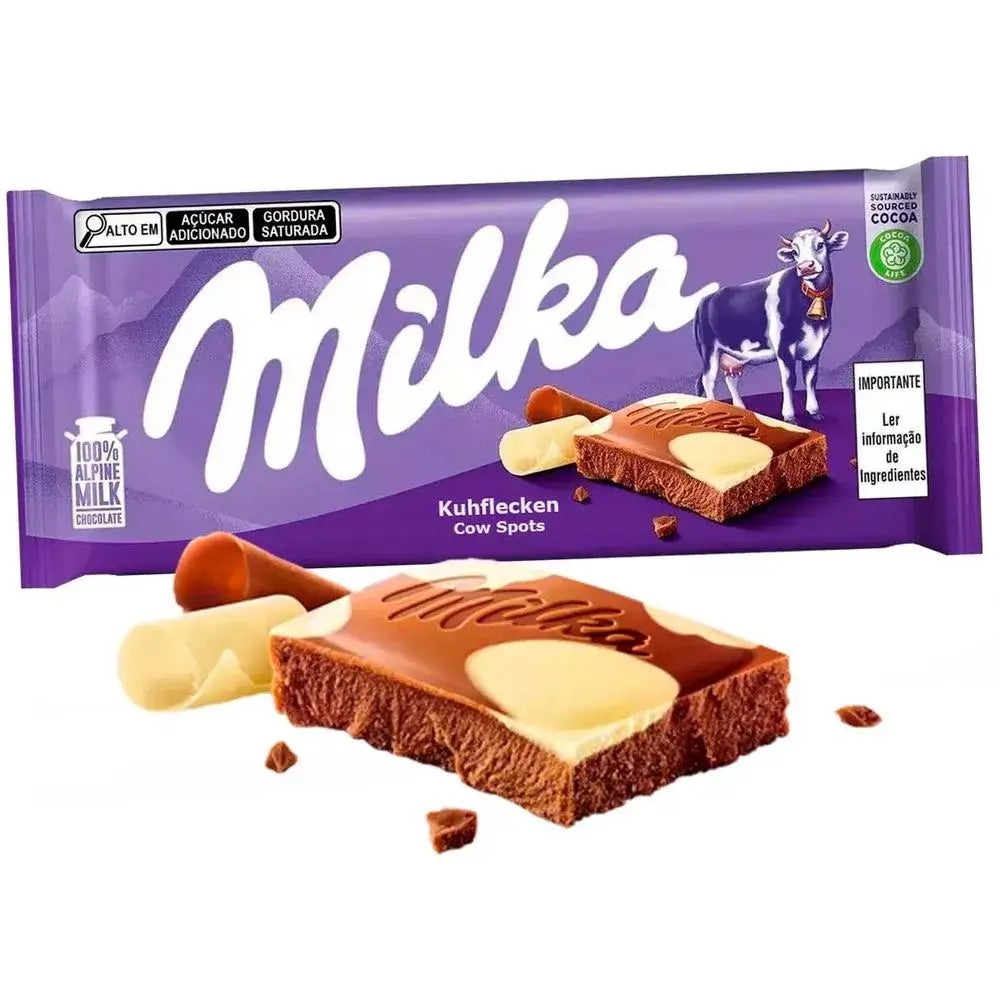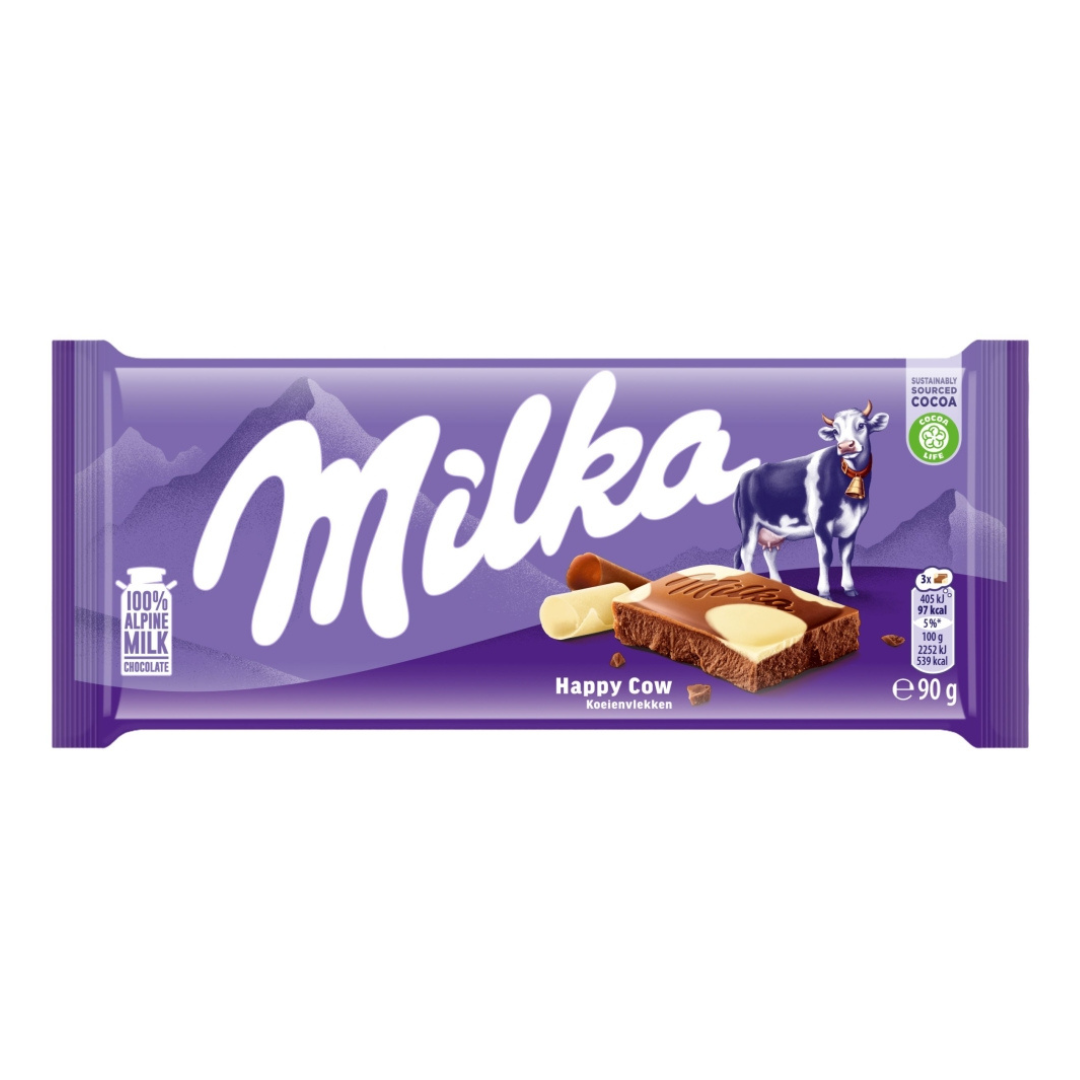 Milka Alpine Cow Spot Chocolate Bar 90g combines smooth Alpine milk chocolate with playful white chocolate spots for a delightful treat.