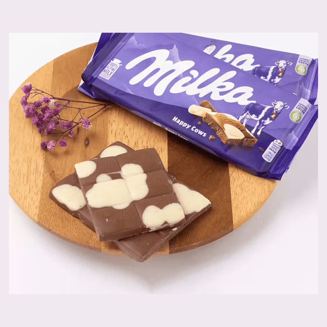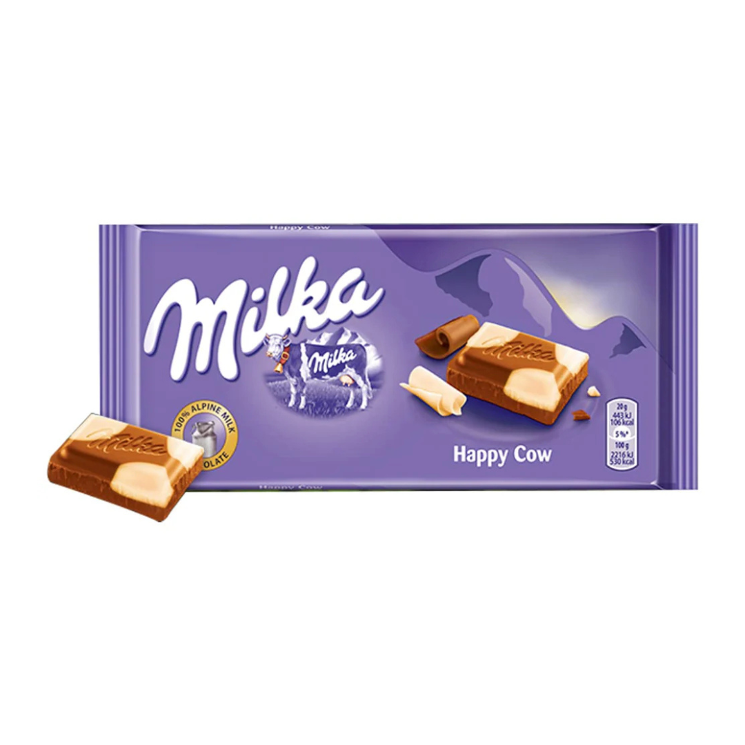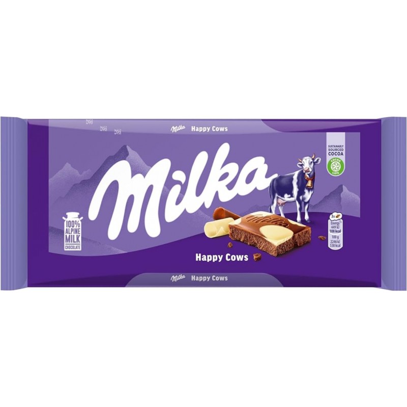 Milka Happy Cows Milk Chocolate Bar 100g is a smooth, creamy milk chocolate bar made with high-quality Alpine milk.