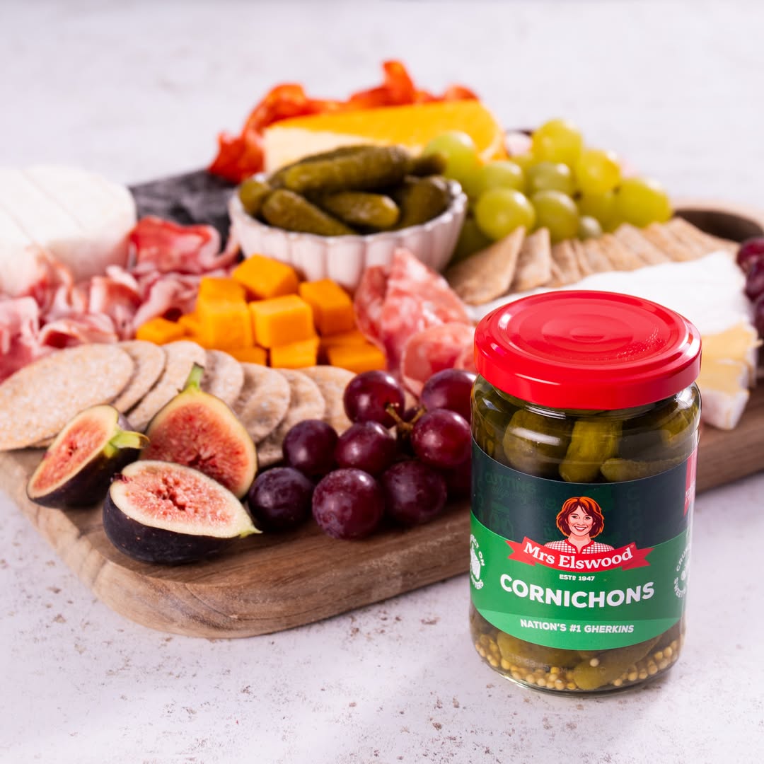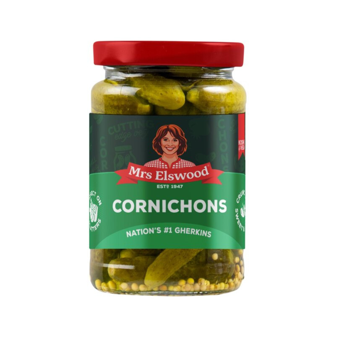 Mrs Elswood Cornichons 215g are crunchy, sweet, and tangy pickled gherkins, perfect for platters and snacks.