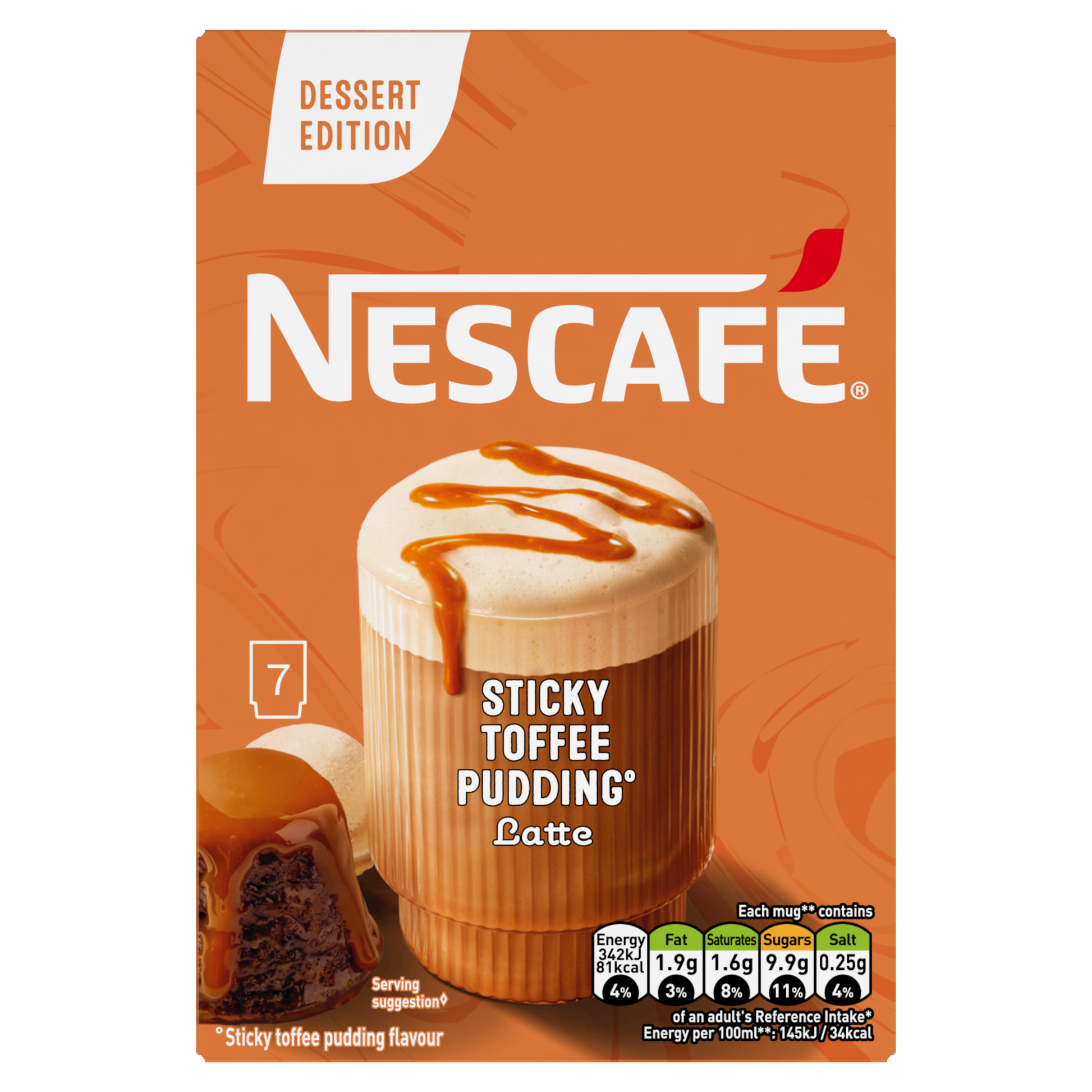 Nescafé Gold Sticky Toffee Pudding Latte Sachets 140g offers the indulgent taste of sticky toffee pudding combined with smooth, creamy coffee.