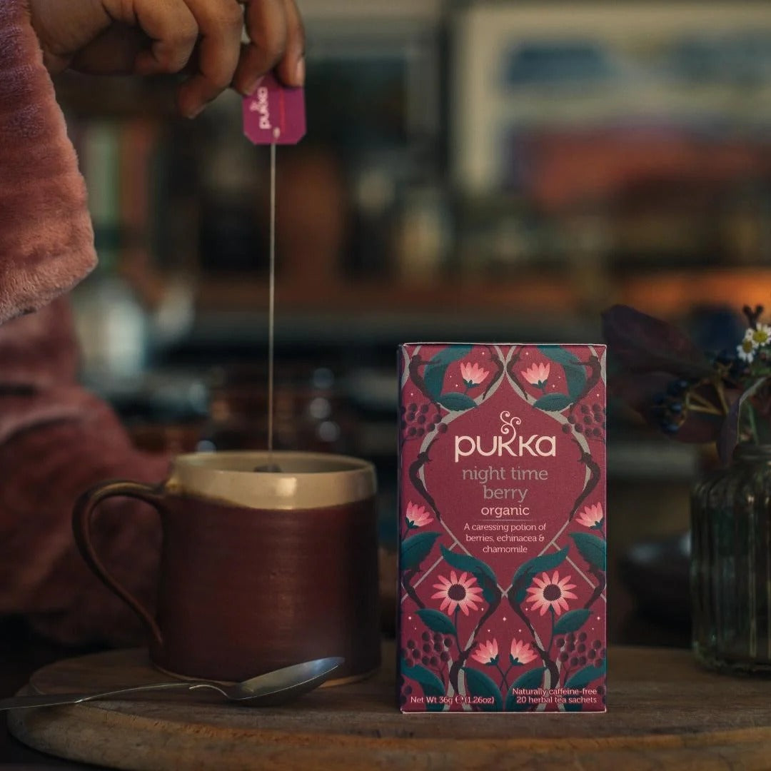 Unwind and prepare for a restful night with Pukka Night Time Berry Herbal Tea 20s 32g, a soothing blend designed to calm the mind and body.