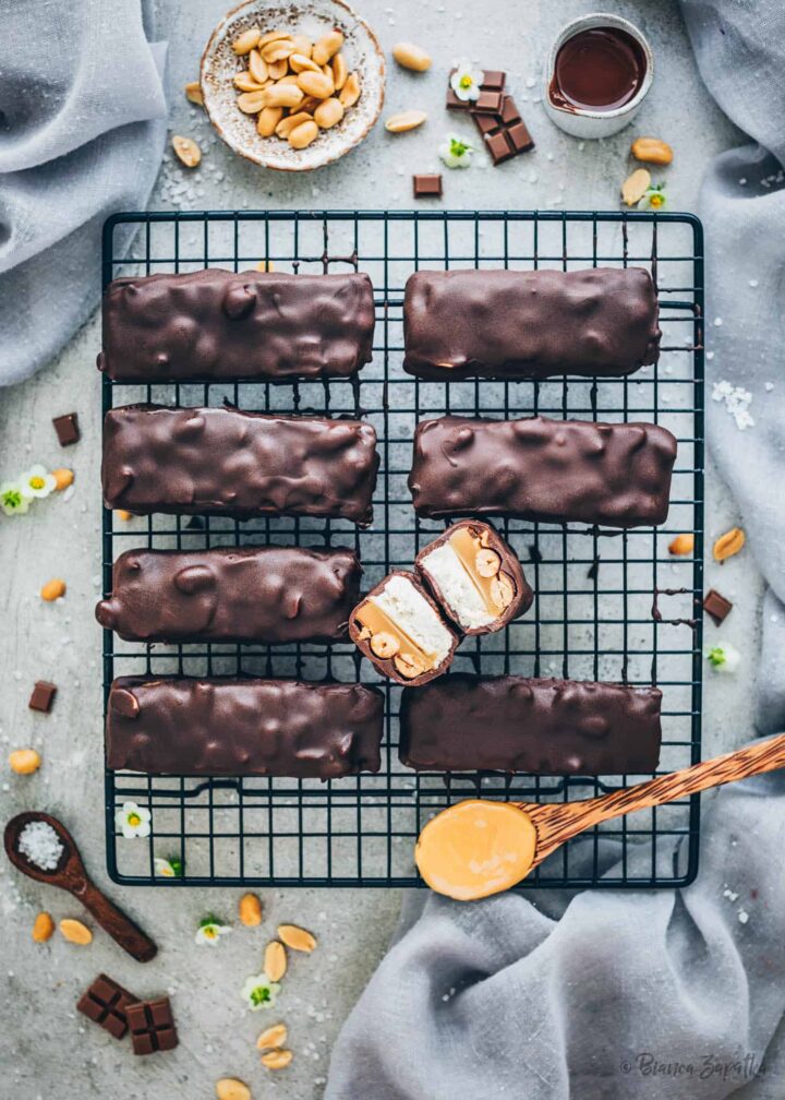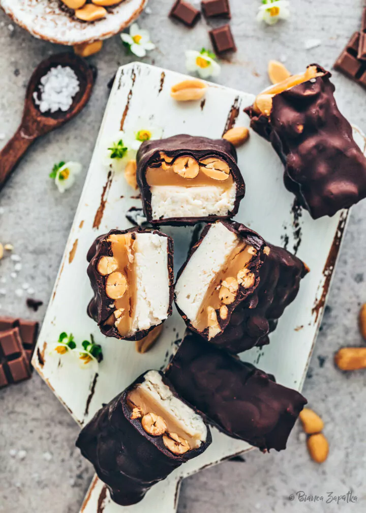 Each bar features a rich peanut butter ice cream center swirled with caramel and crunchy peanuts.