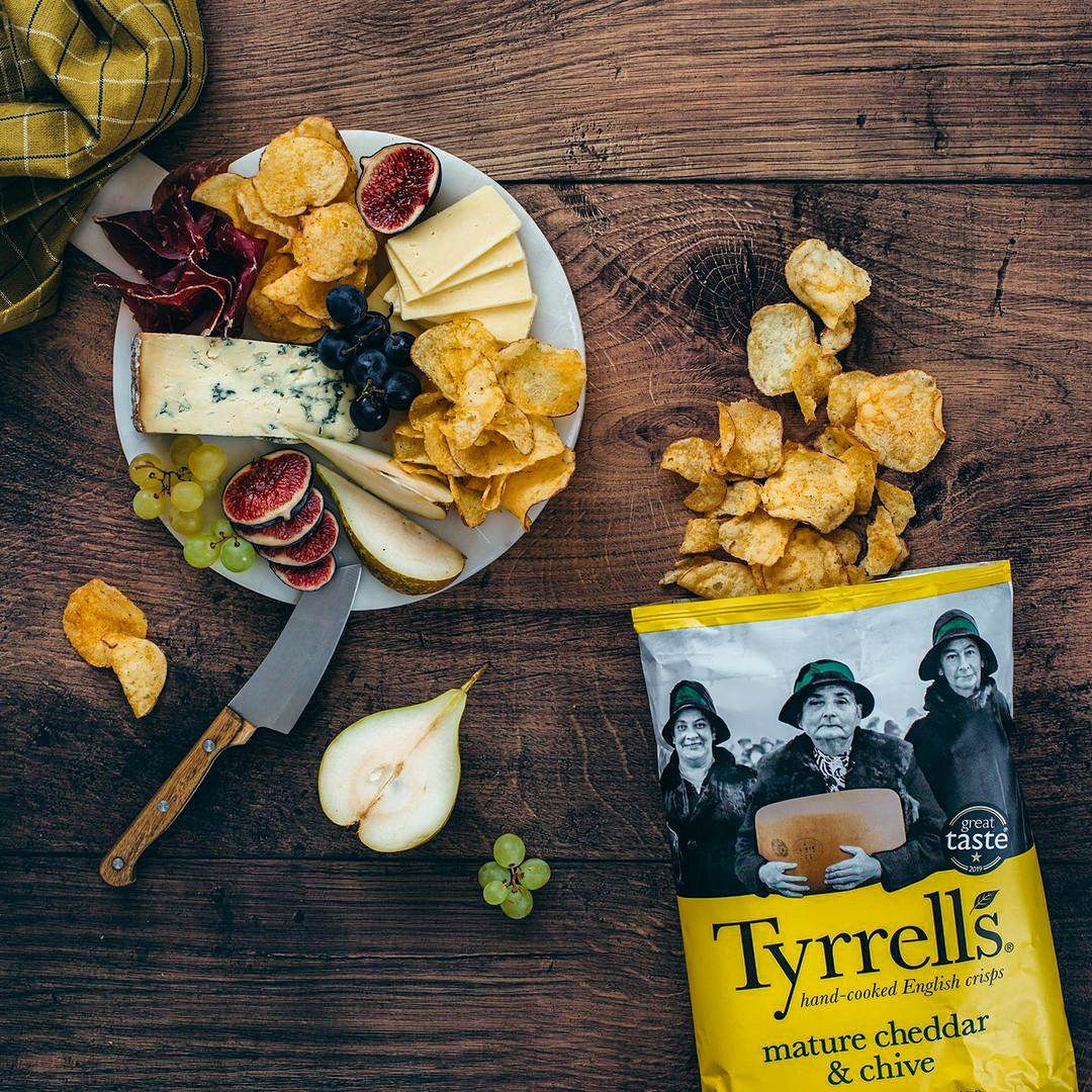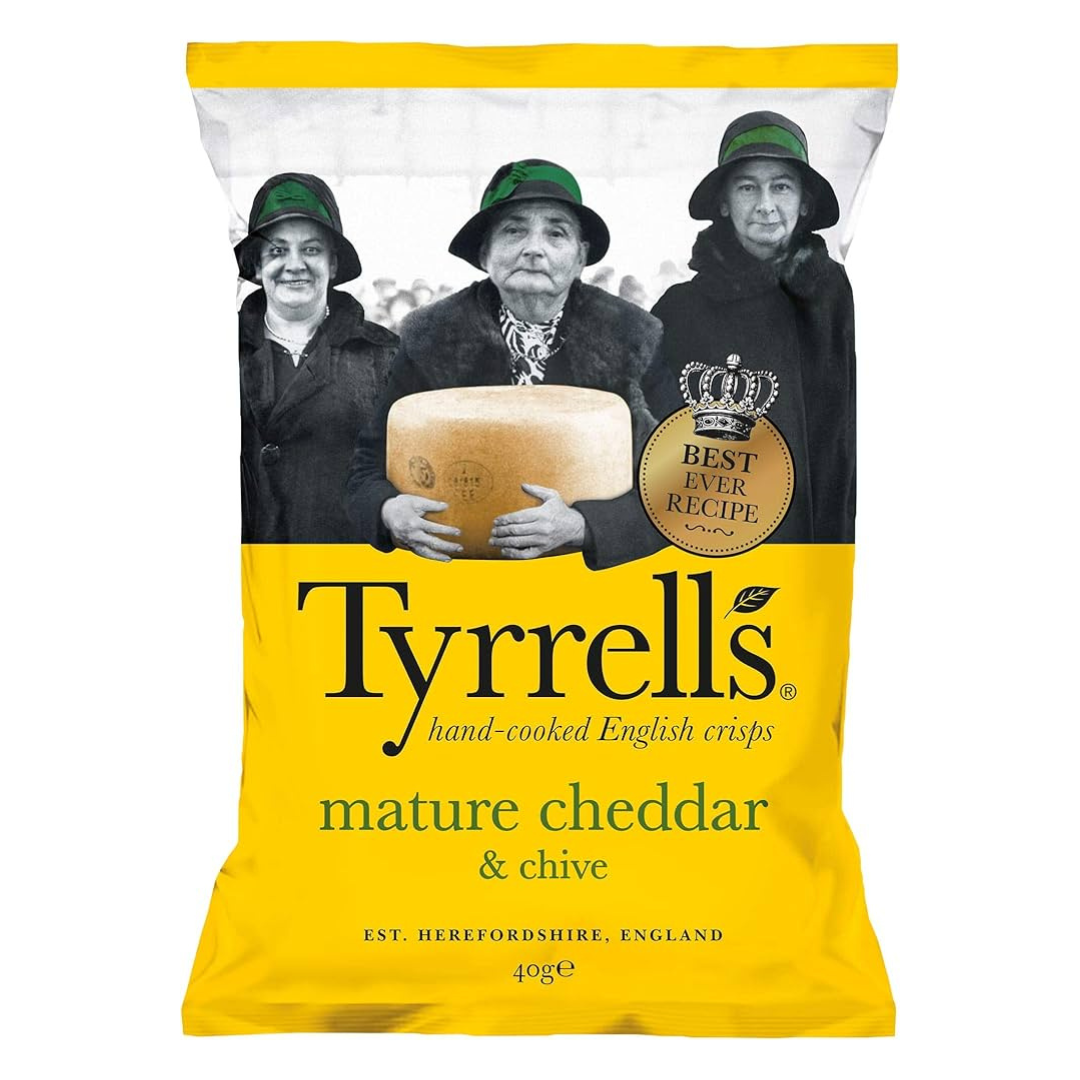 Tyrrells Cheddar Cheese & Chives Crisps deliver a delicious combination of rich cheddar cheese and fresh chives for a savory and satisfying snack.