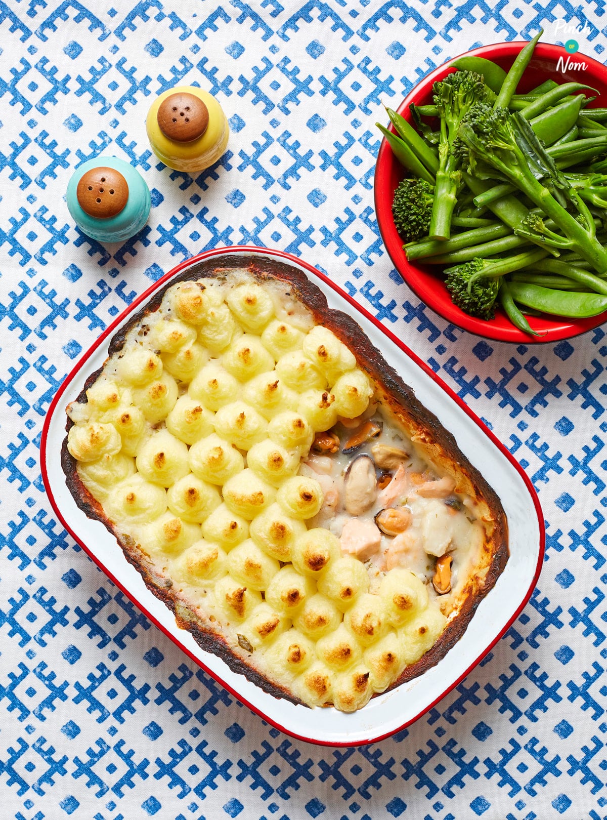 เนื้อปลาในครีมชีสและซอสกุยช่าย ราดด้วยมันบดและเชดดาร์ชีส