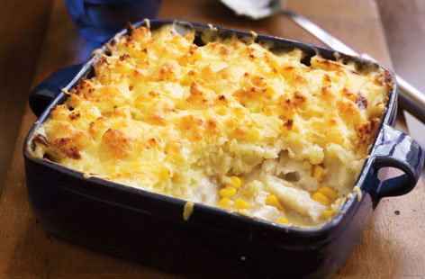 Fish fillet in cream cheese and chives sauce Topped with mashed potatoes and cheddar cheese