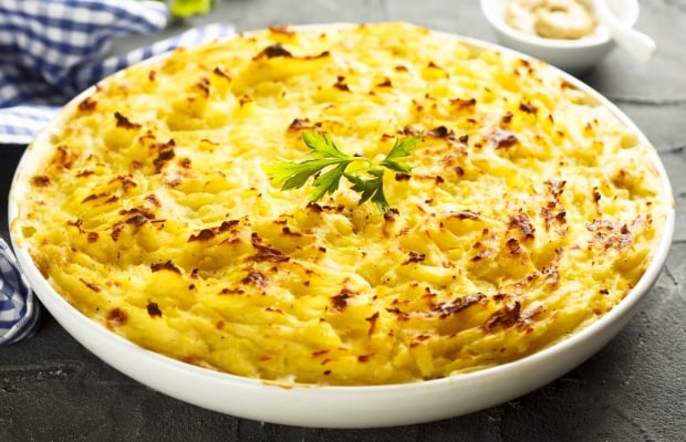 ชิ้นเนื้ออลาสก้าพอลลอคในชีสและซอสพริก ราดด้วยมันบดและเชดดาร์ชีสที่ปรุงขึ้นใหม่บางส่วน